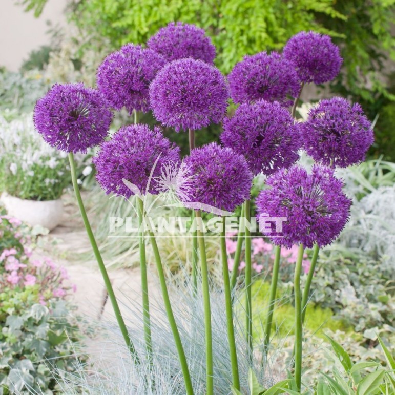 Cet ail produit de grandes têtes de fleurs violettes en forme de globes. C'est le premier de nos variétés d'ail à fleurir, à partir de début mai. Plantez en sol bien drainé en plein soleil.