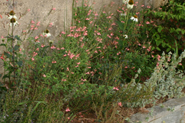 Son feuillage est parfumé, un peu fruité. Dans un massif ou en pied de mur coté soleil, elle fait vraiment une belle tache de couleur dans le jardin. La couleur douce de ses fleurs, pêche saumonnée, s'associe agréablement avec du bleu (comme les verveines dans la photo ci dessous) ou des plantes au feuillage un peu plus foncé.