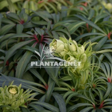 Le Pied de griffon a un feuillage vert glauque persistant étroitement lobé et denté. Des grappes de fleurs vert pâle apparaissent en fin d'hiver. C'est une plante robuste résistante et de longue vie.