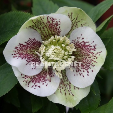 Cette Hellébore a un magnifique feuillage vert foncé strié de rose et d'argent coriace et denté. A la fin de l'hiver des bouquets de fleurs vertes chartreuses teintées de rose apparaissent. Elle résiste à la sécheresse.