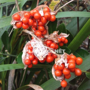 Cet iris est une excellente plante pour l'ombre sèche. Son beau feuillage vert foncé et persistant est décoratif toute l'année. Ses fleurs mauves s'épanouissent discrètement en été et laissent ensuite la place à des fruits orange vif remarquables à l'automne. Attention, ces jolis grains sont toxiques, ne pas ingérer.