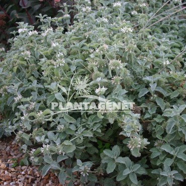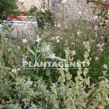 Décoratif toute l'année par son feuillage duveteux vert tilleul aux petites feuilles arrondies et à l'aspect plissé, ce marrube offre en été une floraison rose mauve groupée en bouquets le long des tiges. Il convient à une utilisation en bordure ou rocaille.