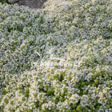 Voici un Thym bas et tapissant au feuillage vert émeraude et aux fleurs blanches. Il peut être planté entre des pavés.