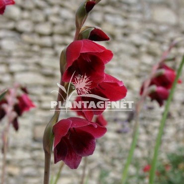 Ce superbe hybride de glaïeul est complètement rustique. Il produit de long épis de fleurs rouge grenat de juin à septembre.