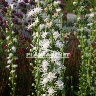 C'est un Liatris aux hampes florales blanches, une vivace bulbeuse, de culture facile en sol bien drainé mais pas trop sec. C'est une bonne fleur à couper.