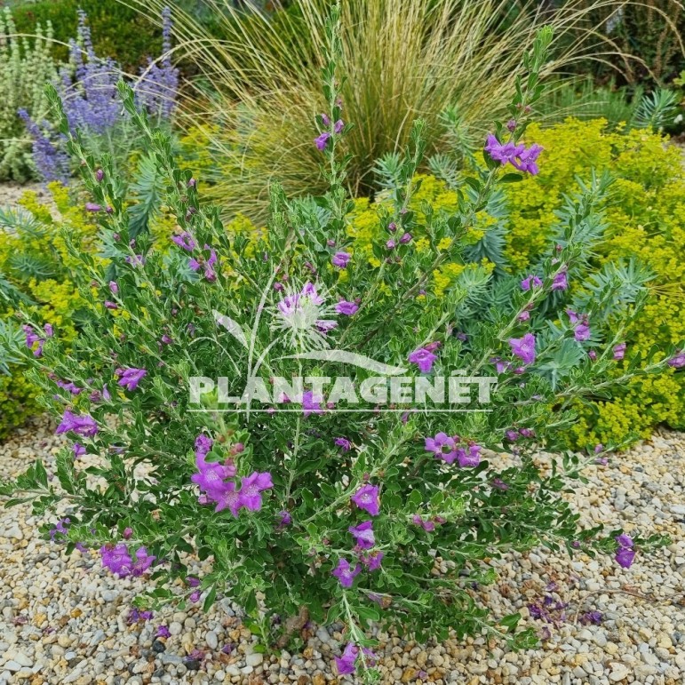 Très jolie arbuste pour le jardin sec. Port compact et feuillage persistant vert gris foncé. Il produit des masses de fleurs rose violet, prisées par les abeilles, en fin d'été ou à l'automne dès que la pluie arrive. Il est adapté aux terrains difficiles, secs ou calcaires.