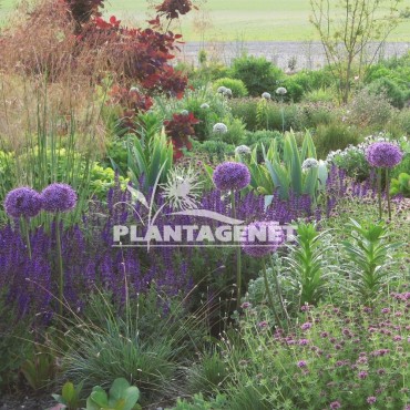 C'est une variété d'ail exceptionnelle. Ses tiges robustes portent d’énormes ombelles sphériques (plus de 22cm de diamètre) de fleurs étoilées violet. Après une longue floraison la tête fanée reste attirant l'œil dans un massif. Plantez en sol drainant en plein soleil.
