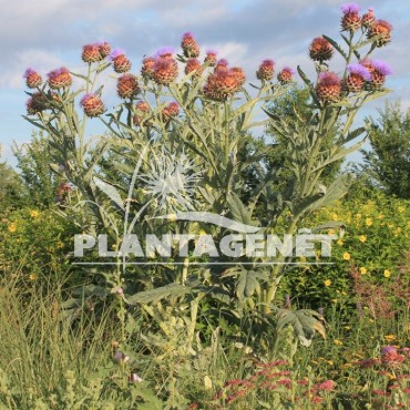 Le cardon forme une touffe d'énormes feuilles gris argenté d'où émergent des fleurs d’artichaut géantes mauves. Une plante prendre plus d' 1 m² donc il n'est pas pour le petit jardin, mais il donne de la hauteur et de la structure dans un grand massif.
