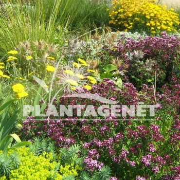 La marjolaine, appelée aussi origan, forme des touffes denses de feuillage aromatique vert grisâtre. Ses fleurs sont rose lilas. Ses feuilles et ses fleurs sont comestibles. Variété la plus parfumée et résistante à la sécheresse, c'est une bonne plante pour bordure, rocaille, couverture de talus secs, en plein soleil.