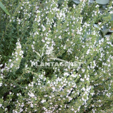 La Sariette d'hiver est un arbuste persistant aux petites feuilles vertes luisantes et aromatiques qui sont surmontées de fleurs blanches. Elle est jolie en bordure et est utilisée en condiment comme le thym.
