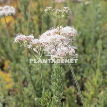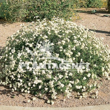 Cet arbuste persistant, appelé sarrasin californien, forme une touffe dressée de petites feuilles épaisses. Il produit des fleurs blanc rosé de la fin du printemps à l'hiver. Très résistant à la sècheresse et mellifère, il est idéal pour le jardin sec.