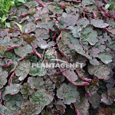 Voici une Heuchère vigoureuse, au feuillage pourpre brillant teinté de brun bronze. Elle a des fleurs roses. C'est un bon couvre-sol quand il est planté en masse.